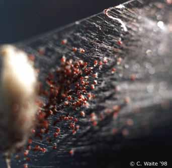 The nymph spiderlings move outward from the cocoon en masse, jointly building a broad, linear web structure. The nymphs begin to moult along the way, using the more remote areas of the group web for this purpose. The Nephila madagascariensis are still a deep red color at this point. In the coming week, the moulted spiderlings will be capable of attacking and eating a small fruitfly in groups of three or four. The less developed of the siblings appear wary of cannibalism at this phase as well. |