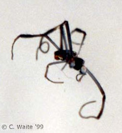 The second generation N. madagascariensis suffered significantly from the problem of deformed legs, all cases dying consequently from starvation. The deformed spiders are incapable of building webs. My initial thought was to blame the deformity on inbreeding, but after researching the original brood's history and numerous consultations with more experienced spider breeders, this did not seem to be the case. Spiders can apparently be inbred 8 - 13 generations before problems occur. My spiders were only one generation inbred. Dr. Peter Klaas, head of the insect department at the Cologne aquarium, proposed that such problems with the legs are caused by dehydration. Spiders must build up a layer of fluid between the old and the new skin during moulting. If the spider is dehydrated, it can manifest problems during the extraction of the legs. Starvation due to the inability to produce the external digestive fluids can also be caused by dehydration, even when food is hand fed. Nephila madagascariensis require nearly 100% humidity, as well as a mean temperature of 27 deg. Celcius, an environment which is extremely difficult to maintain in a temperate region. 37 |
